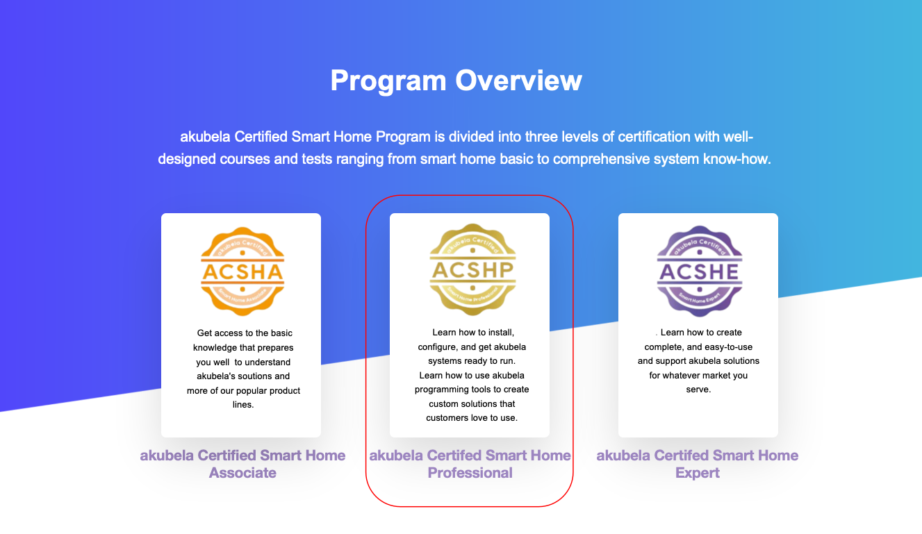 akubela Certified Smart Home Program is divided into three levels of certification with well-designed courses and tests ranging from smart home basic to comprehensive system know-how.